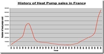 Sa slike se veoma jasno vidi da su pikovi prodaje u vreme velikih energetskih kriza, u vreme skupe energije. Moje pitanje je: da li se tzv alternativnim izvorima energije treba okretati samo u kriznim vremenima? Na sreću odgovor je NE. Francuska je shvatila svoju lekciju iz 70–tih godina prošlog veka i sada spada u tržišta sa najvećim rastom prodaje toplotnih pumpi (oko 30% godišnje).